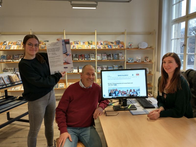 Im 1. OG wird zudem eine „Chill-Lounge“ eingerichtet, in der Getränke und Süßigkeiten angeboten werden. Kleine Speisen und Getränke dürfen für die Stärkung zwischendurch auch selbst mitgebracht werden. Im alten Ratssaal gehen Jürgen Overkott, Redakteur bei der Westfalenpost, und Gina Friedrichs, Mitarbeiterin der Stadtbücherei, grundlegenden Recherchefragen in Verbindung mit dem Berufsbild des Redakteurs oder der Redaktuerin auf den Grund: Wie kommen eigentlich Journalistinnen und Journalisten an ihre Informationen? Was ist pressetechnisch erlaubt und was nicht? Sind alle Informationen der Presse verlässlich?