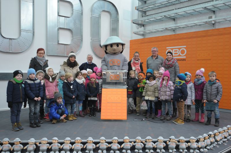Zum Abschluss wurden die Vorschulkinder dann vom OBO-Maskottchen, dem Männchen mit Helm, überrascht und erhielten, nach einer kleinen Trinkpause, als Andenken ein OBO-Stoffmännchen mit einem Schlüsselanhänger.