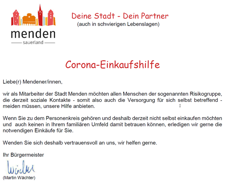 Die Stadtverwaltung bietet ab sofort eine Einkaufshilfe für alle Mendenerinnen und Mendener an, die zur Risikogruppe gehören. Das sind Menschen, die derzeit soziale Kontakte - somit also auch die Versorgung für sich selbst betreffend - meiden müssen.