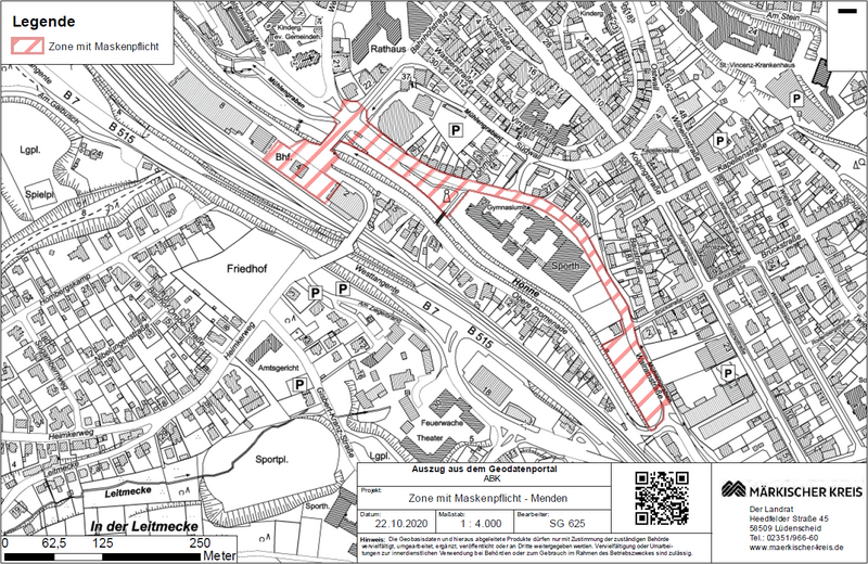 In der Allgemeinverfügung des Märkischen Kreises werden Außenbereiche in einigen Städten im Kreisgebiet konkret benannt, an denen eine Mund-Nasen-Maske verpflichtend getragen werden muss. Für die Stadt Menden gilt demnach eine Pflicht für den Bereich Bahnhofstraße (vom Bahnhofsvorplatz bis Kreuzung Walramstraße/ Bahnhofstraße/ Westwall/ Bodelschwinghstraße) und für die Walramstraße (von der Kreuzung Walramstraße/ Bahnhofstraße/ Westwall/ Bodelschwinghstraße bis zum Parkplatz „Schlachthof“). Außerdem weist die Stadt Menden auf die Maskenpflicht an allen Bushaltestellen im Stadtgebiet hin, die in § 2 III Nr. 9 CoronaSchV bereits geregelt ist. Eine Maskenpflicht besteht zudem auf dem Mendener Wochenmarkt.