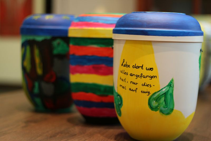 Neun Urnen hat das Bestattungshaus Albert & Stahl aus Menden zur Verfügung gestellt. Dazu die passenden Farben, um die äußeren Hüllen der Aschekapseln bemalen zu können. Unter der Leitung von Silvia Potthoff sind sie zu dem Schluss gekommen: "Das Ende kann bunt sein." Und ist es wirklich das Ende? Den Tod und das Sterben wieder in die Mitte der Gesellschaft zu holen und sich mit dem Abschiednehmen vertraut zu machen, das will die Ausstellung zeigen.