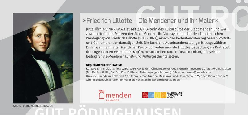 Auf Einladung des Museums- und Heimatvereins Menden (Sauerland) e.V. und der Museen der Stadt Menden unter der Leitung von Marius Stiehler stellt Jutta Törnig-Struck, Leiterin des Kulturbüros der Stadt Menden, am Mittwoch, 29.04.2026 um 18.00 Uhr im Rahmen eines öffentlichen Vortrages den künstlerischen Werdegang von Friedrich Lillotte, einem der bedeutendsten regionalen Porträt- und Genremaler der ausgehenden Biedermeierzeit, vor.