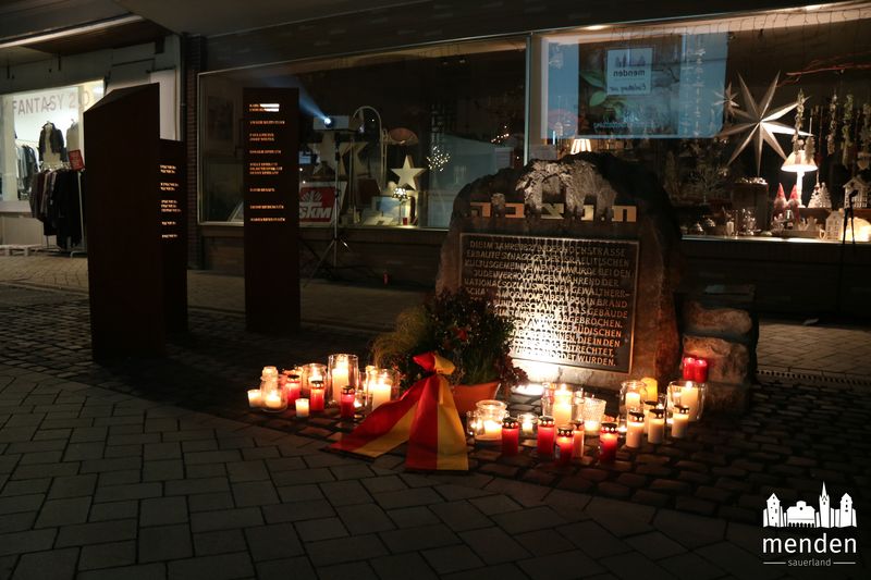 In jedem Jahr spielt der „Ort des Erinnerns“ in der Hochstraße, wo früher einmal die Mendener Synagoge stand, am 9. November eine besondere Rolle. Traditionell legt der Bürgermeister eine Blumenschale oder einen Kranz nieder. Zahlreiche Menschen schließen sich an und lassen Kerzen an den Metallstehlen zurück. Währenddessen werden die Namen derer verlesen, die zur Zeit des Holocaust aus Menden deportiert, ins Konzentrationslager gesperrt und ermordet wurden. Auch derer wird gedacht, die fliehen mussten. Die aus Angst vor den Nationalsozialisten ihre Heimat für immer verließen. Bundesweit ist der 9. November Gedenktag. Denn 1938 brannten in der Reichspogromnacht im ganzen Land die Synagogen. Auch in Menden.