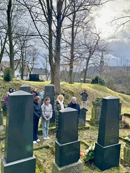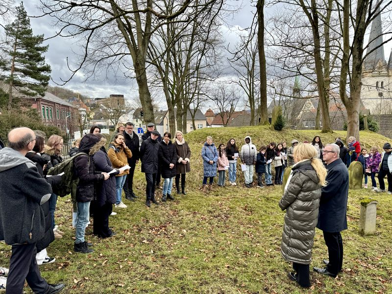 Genau heute vor 80 Jahren, am 27. Januar 1945, ist das Konzentrationslager Auschwitz befreit worden. Mit dem Internationalen Tag des Gedenkens an die rund 6 Millionen Opfer des Holocaust am 27. Januar, erinnern die Vereinten Nationen und die Weltgemeinschaft an das schlimmste Verbrechen in der Geschichte der Menschheit. Gemeinsam mit Schülerinnen und Schülern der Realschule Menden, Vertretern der politischen Parteien und aus dem Verwaltungsvorstand, hat Mendens Bürgermeister Dr. Roland Schröder heute auf dem jüdischen Friedhof der Opfer des Holocausts gedacht. Er machte deutlich: „Wir müssen uns immer wieder daran erinnern, was hier in Deutschland geschehen ist – damit dies nicht noch ein-mal passiert.“