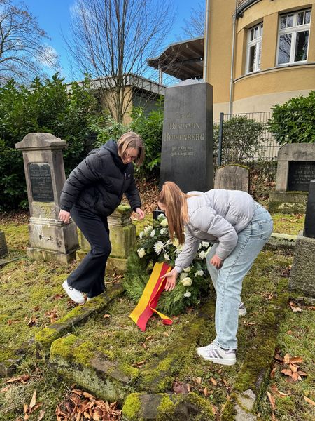Gemeinsam mit den Schülerinnen und Schülern legte Bürgermeister Schröder auf dem jüdischen Friedhof am Grab der Familie Reifenberg einen Kranz nieder.
