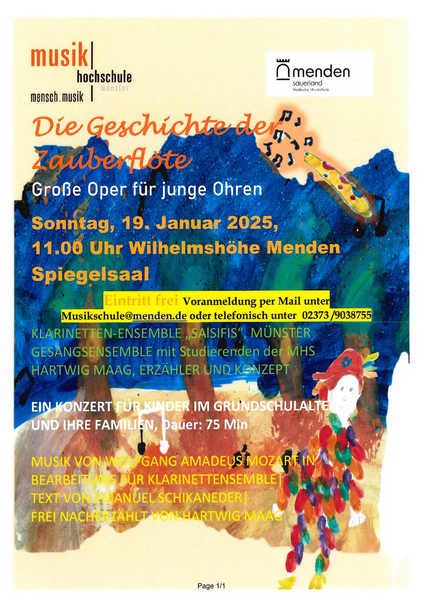 Das Programm wird von Hartwig Maag, der das Publikum als Erzähler durch die Geschichte führt, in Zusammenarbeit mit dem Klarinettenquintett Salsifis und einem Gesangsensemble mit Studierenden der Musikhochschule Münster gestaltet. Die minimalistische Besetzung eröffnet einen neuen, erfrischenden Zugang zu Mozarts Oper und bietet eine spannende Mischung aus klassischer Musik und Erzählung. Die Veranstaltung wird von der Städtischen Musikschule Menden und ihrem Förderverein organisiert und richtet sich an Kinder im Grundschulalter mit ihren Familien. Der Eintritt ist frei. Das Team der Musikschule Menden betont. „Dies ist eine schöne Gelegenheit, eine der bekanntesten Opern der Musikgeschichte in einem leicht zugänglichen Format zu erleben, in dem die verzaubernde Kraft des Märchens gerade für Kinder erlebbar wird.“