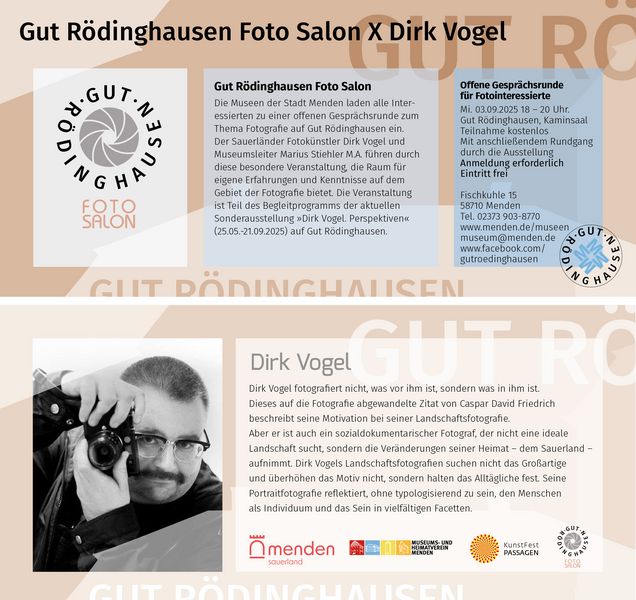 Die Museen der Stadt Menden laden alle Interessierten zu einer offenen Gesprächsrunde zum Thema Fotografie auf Gut Rödinghausen ein. Der Sauerländer Fotokünstler Dirk Vogel und Museumsleiter Marius Stiehler M.A. führen durch