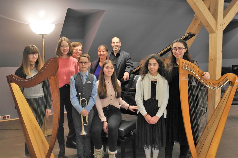 Mit ihren erfolgreichen Teilnehmerinnen und Teilnehmern freuen sich die Lehrkräfte Janko Tajnsek (Trompete), Anna Polomoshnykh (Klavier) und Martina Busemann (Harfe).