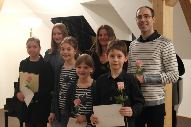 Mit ihren Schülern freuen sich die Klavierlehrerin Martina Busemann und der Trompetenlehrer Janko Tajnsek.