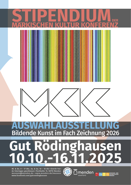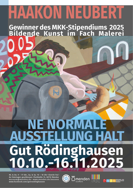 Die Museen der Stadt Menden und die Märkische Kulturkonferenz e.V. (MKK) freuen sich mit »Haakon Neubert - NE NORMALE AUSSTELLUNG HALT« und der Auswahlausstellung der Märkischen Kulturkonferenz e.V. (MKK) Bildende Kunst im Fach Zeichnung 2026 die Eröffnung von gleich zwei neuen Sonderausstellungen ankündigen zu dürfen, die vom 10.10. bis zum 16.11.2025 auf Gut Rödinghausen zu sehen sein werden. In den historischen Räumlichkeiten von Gut Rödinghausen wird zum einen die Einzelausstellung von Haakon Neubert präsentiert, dem Gewinner des MKK-Stipendiums Bildende Kunst im Fach Malerei von 2025. Mit seiner Kunst wird international aufstrebende deutsche Malerei nun auch in Menden-Lendringsen gezeigt, nachdem der Künstler dieses Jahr in Paris Station gemacht hat und als Nächstes nach Berlin und Wien weiterzieht.