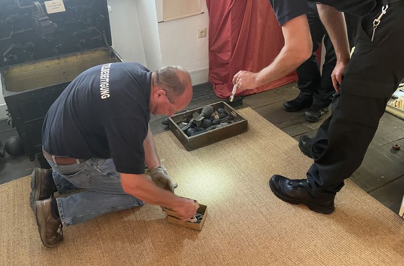 Bei den Vorbereitungen für eine neue Ausstellung im Museum der Stadt Menden wurde der Fundus in mehreren Lagern gesichtet. Dabei wurden Kampfmittel aus dem Ersten und Zweiten Weltkrieg entdeckt. Sowohl im Stadtmuseum als auch in einem Kellerraum unter der Kita Am Papenbusch, der durch das Museum als Lager genutzt wird, wurden Granaten und Munition entdeckt. Alle gefundenen Kampfmittel wurden bereits vor mehr als 70 Jahren im Museum angenommen. Museumsleiterin Jutta Törnig-Struck zeigte sich schockiert: „Mir wurde, als ich das Museum übernommen habe, versichert, dass alles ungefährlich ist und sich keine scharfen Kampfmittel unter den Exponaten befinden.“ Da die Museumsmitarbeiterinnen aber auf „Nummer Sicher“ gehen wollten, verständigten sie sofort das Ordnungsamt der Stadt. Abteilungsleiterin Manuela Schmidt: „Uns war schnell klar, dass es sich nicht um harmlose Museumsexponate handelt. Daher haben wir unverzüglich die Feuerwehr und den Kampfmittelräumdienst der Bezirksregierung Arnsberg eingeschaltet. Die Experten waren innerhalb einer Stunde in Menden. So wie es bei spontanen Kampfmittelfunden Standard ist.“