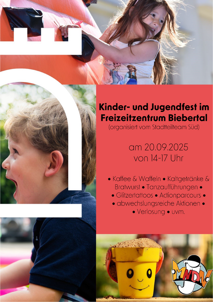 Am Samstag, 20. September, wartet das bunte Treiben des Kinder- und Jugendfestes im Freizeitzentrum Biebertal auf Groß und Klein. Organisiert durch das Stadtteilteam Süd finden verschiedene kostenlose Aktionen rund um den Weltkindertag und das diesjährige Motto „Kinderrechte - Bausteine für Demokratie“ statt.