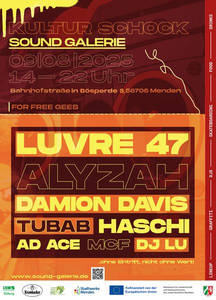 "Live-Acts wie LUVRE47 werden Menden mit erstklassigem Hip-Hop bereichern. Zusätzlich wird Inspiration zum Greifen nah, Künstler:innen werden Wände bunt gestalten. Wer selbst aktiv werden will, kann beim Skate-Contest zeigen, was er oder sie drauf hat, fette Preise inklusive! Außerdem gibt es eine Open Mic Session und einen Bereich zum Zeichnen!