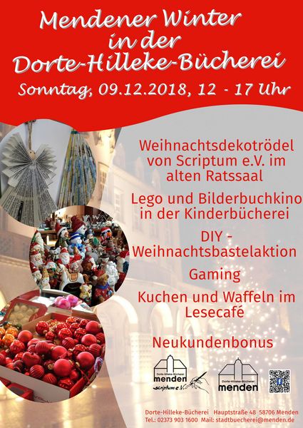 Auch in diesem Jahr öffnet die Dorte-Hilleke-Bücherei zum Mendener Winter ihre Türen. Am 9. Dezember 2018 bietet das Team der Bücherei von 12 bis 17 Uhr ein vielseitiges Programm an. Auf dem Trödelmarkt vom Förderverein Scriptum e.V. im Alten Ratssaal wartet eine Menge Weihnachtsdekoration darauf, ein neues Zuhause zu finden. Wer unter den vielen Schätzen nichts findet, hat bei einem Bastelangebot die Möglichkeit, selbst kreativ zu werden. Durch einfache Handgriffe werden alte Bücher in Weihnachtsbäume, Engel oder Geschenktüten verwandelt; aus bunten Bügelperlen können weihnachtliche Figuren und Anhänger geformt werden. In der Kinderbücherei kommen die Kleinsten bei einem Bilderbuchkino auf ihre Kosten. Weiterhin liegen dutzende von Legosteine zum Spielen bereit. Außerdem können Gamingbegeisterte ihre Fahrkünste bei einer Partie „Mario Kart“ auf der Wii U unter Beweis stellen. Das Team des Lesecafés lädt alle Winterbesucher zu Kaffee, Kuchen und Waffeln ein. Das Haus ist für jedermann geöffnet; Ausleihen und Rückgaben können wie gewohnt stattfinden. Besucher, die sich an diesem Tag neu als Leser in der Bücherei anmelden, erhalten 3 Monate zusätzliche Lesezeit geschenkt.