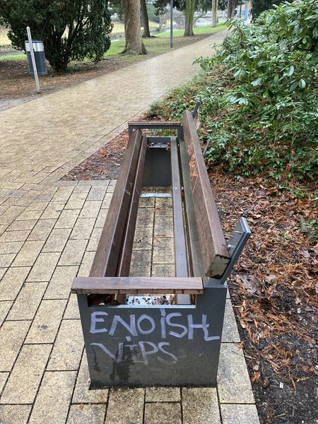 Da die herausstehenden Schrauben und fehlenden Holzbohlen eine akute Unfallgefahr darstellten, wurde die Bank provisorisch durch Mitarbeiter des Bauhofes repariert. Sitzen kann darauf aber aktuell niemand mehr.