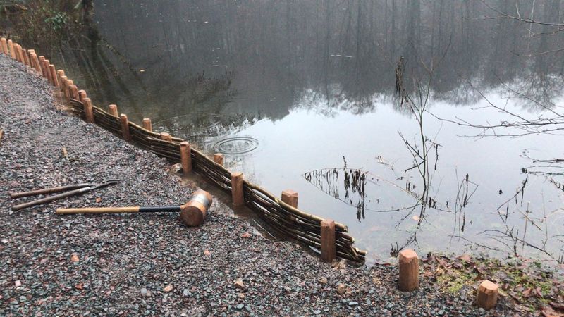 Nach dieser ersten Phase lässt sich nun feststellen, dass die neue Ableitung gut funktioniert. Auch Starkregen und Hochwasser fließen ab. Allerdings sinkt der Pegel des Hexenteiches jetzt langsamer als es zuvor mit den Pumpen der Fall war. Aufgrund der Umbauten ist der normale Pegel des Hexenteiches jetzt um circa 40 Zentimeter höher als das vorher der Fall war. Um das auszugleichen wurden jetzt auch die Wege rund um den Teich angefüllt und an den Rändern mit Naturmaterialien (Eichenpfähle, Korbgeflecht usw.) befestigt. Was jetzt noch folgt sind die Feinheiten: Die Wege werden noch einmal abgezogen und es wird feineres Material ausgebracht. Durch diese so veredelten Wege bleibt die Aufenthaltsqualität am Hexenteich erhalten und wird sogar noch verbessert. Allerdings werden diese zusätzlichen Arbeiten an den Wegen noch ein wenig auf sich warten lassen müssen. Aktuell haben die Arbeiten, die durch Orkantief „Friederike“ entstanden sind, Vorrang.