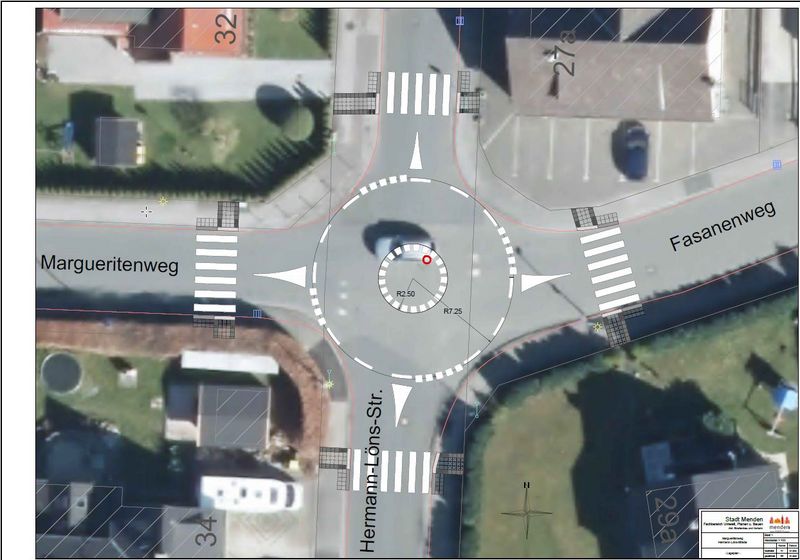 „Einfach nur Streifen auf die Fahrbahn pinseln, das war gestern. Heute ist das Einrichten von Fußgängerüberwegen weitaus aufwändiger.“ Deshalb werden die Arbeiten an Glockenblumenweg, Margueritenweg, Fasanenweg und Hermann-Löns-Straße in Menden nicht an einem Tag beendet sein, so Dirk Wiegand, Abteilungsleiter „Straßenbau und Verkehr“ bei der Stadt Menden. Denn so ein Überweg hat inzwischen standardmäßig eine eigene Beleuchtung, taktile Elemente und eine Absenkung des Bordsteines auf null. So werden auch Fußgänger mit einer Behinderung die Straßen in diesem Bereich sicher queren können. Zusätzlich zu diesen insgesamt sechs Überwegen, besser bekannt als Zebrastreifen, wird es an der Kreuzung Hermann-Löns-Straße / Margueritenweg einen Mini-Kreisverkehr geben. „Von der Größe ist dieser Kreisverkehr vergleichbar mit dem neuen Kreisel an der Lendringser Hauptstraße“, so Wiegand.