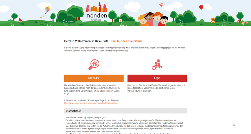 Weitere Informationen sind über https://kita-portal.menden.de/ und über die Internetseiten der Stadt Menden (Sauerland) unter Familie, Soziales und Sport - Unterpunkt Kitas und Kindertagespflege erhältlich.