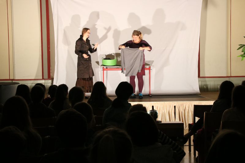 Dabei schlüpfen die beiden Darstellerinnen, Susanne Hocke, ausgebildeten Schauspielerinnen und Theaterpädagogin und Marion Gerlach-Goldfuß, ebenfalls ausgebildete Schauspielerin und Dramatherapeutin, in die Rollen von Jugendlichen, die mit typischen Problemen junger Menschen zu tun haben. Thematisiert werden dabei z.B. Schönheitswahn, Essstörungen und Probleme an der Schwelle zum Erwachsenwerden. Aber auch die Konflikte in der Familie oder mit Freunden, die durch Essstörungen hervorgerufen werden. Im Kern stehen die Fragen: „Wer bin ich? Was will ich? Wo sind meine Stärken? Was macht mich aus?“ Darüber konnten die Schülerinnen und Schüler auch noch nach der Aufführung mit den Schauspielerinnen im Rahmen einer theaterpädagogischen Nachbereitung sprechen. Möglich gemacht wurden diese Aufführungen mit Unterstützung der AOK Nordwest und der Gleichstellungsstelle in Menden.