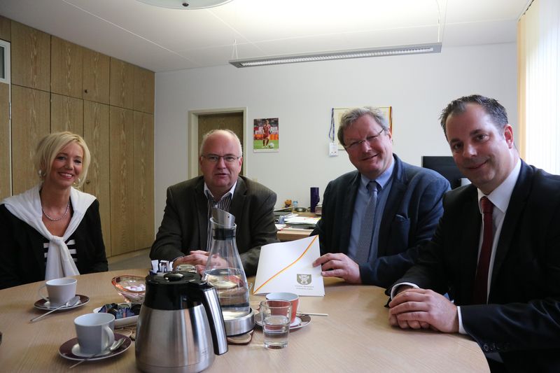 Die Turnhalle des Walburgisgymnasiums Menden kann saniert werden. Dafür wurde jüngst im Mendener Rathaus der Förderbescheid aus dem Kommunalförderungsgesetz NRW, kurz KlnvFöG, durch Bürgermeister Martin Wächter und Melanie Bähr vom Team „Finanzen und Beteiligungen an die Geschäftsleitung des privaten Gymnasiums übergeben. „Ich freue mich sehr darüber, dass wir gemeinsam mit der Stadt Menden etwas für die wichtigsten Menschen in unserer Gesellschaft tun können: für unsere Kinder“, so Stefan Burk, Geschäftsführer der SMMP-Schulen.