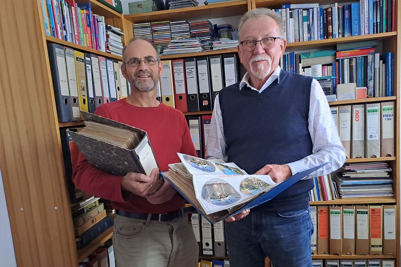 Plakate, Redemanuskripte, Erlebnisberichte und vieles mehr: Einen Einblick in seine private Sammlung hat jetzt Rudolf Düppe Stadtarchivar Stephan Reisloh gewährt. Gemeinsam haben sie Unterlagen des ehemaligen Schulleiters und Bürgermeisters aus 60 Jahren gesichtet, die dem Stadtarchiv zugehen sollen.