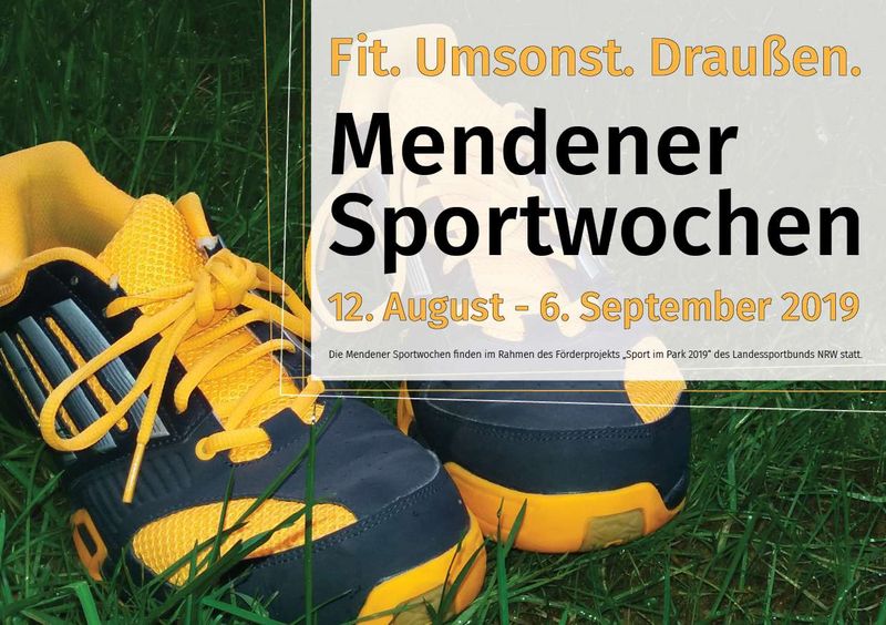 Ab Dienstag, 13. August, beginnen die 1. Mendener Sportwochen. Aktive Sportler und solche, die es noch werden wollen, haben die Möglichkeit, über vier Wochen jede Woche sieben unterschiedliche Sportkurse zu besuchen. Der Clou daran: Das Angebot ist kostenfrei und lädt alle Interessierten zum sportlichen Ausprobieren und Mitmachen unter freiem Himmel ein. Eine Anmeldung ist nicht erforderlich!