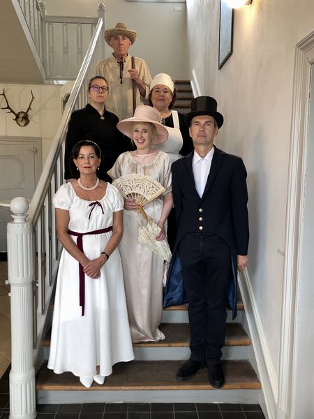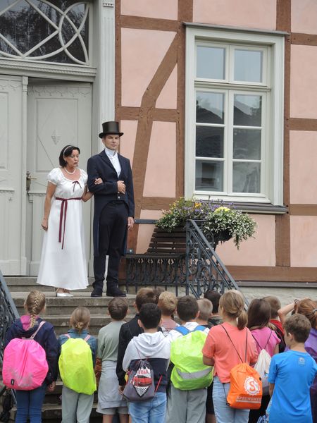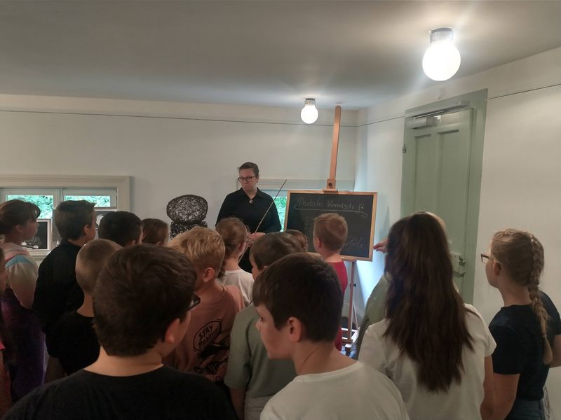 Haupt- und ehrenamtliche Mitarbeiterinnen und Mitarbeiter des Museums schlüpften temporär in die fiktiven Rollen einer vornehmen Adelsfamilie und ihres arbeitsamen Gesindes. Historisch kostümiert als treue Mamsell oder fleißiger Gärtner und begrüßt von Jutta Törnig-Struck als herrschaftlicher Baronin, standen sich die zwei Welten anschaulich gegenüber. Während ihrer rund 90-minütigen Zeitreise in die Vergangenheit bekamen die Schülerinnen und Schüler einen Einblick in das geschäftige Leben auf einem adligen Gutshof. Unter welchen Umständen gleichaltrige Kinder im 19. Jahrhundert aufwuchsen und lernten, brachte ihnen Museumspädagogin Rabea Badeda in der Rolle der gestrengen Hauslehrerin näher. Unter ihrer Anleitung übten sich die Grundschülerinnen und -schüler etwa im Lesen von Kurrentschrift.