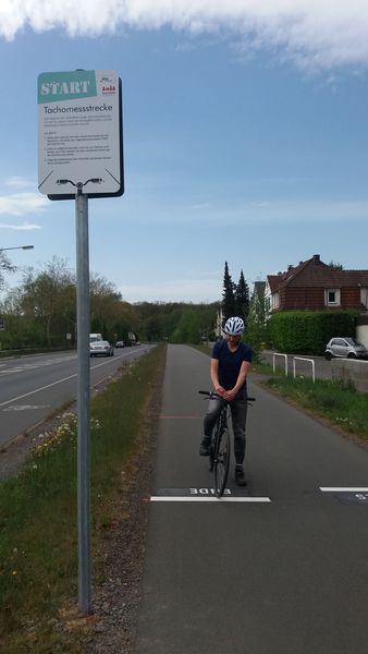 Zwei Schilder markieren dazu jeweils den Anfang und das Ende der „Teststrecke“. Das Schild am Start gibt Auskunft darüber, wie der Tacho einzustellen und dass in möglichst gerader Linie zum Zielschild zu radeln ist. Hier angekommen, findet sich auf dem Schild eine Erklärung zur Einstel-lung des Tachos, wenn dieser mehr oder weniger als die gefahrenen 1.000 Meter anzeigt. Bei-spiele gleich inklusive.