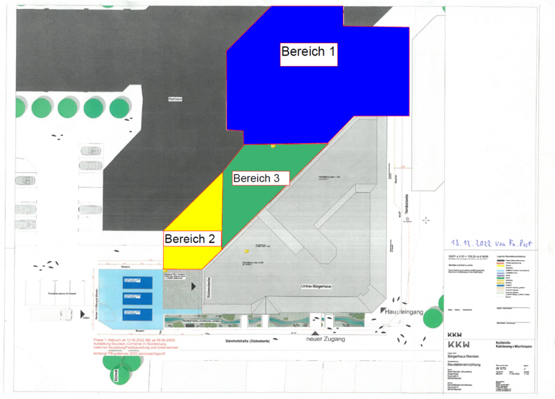 Der städtische Immobilienservice Menden (ISM) beginnt am Montag, 9. Januar die Arbeiten zur Betonsanierung an der Tiefgarage des Neuen Rathauses. Zunächst wird die Baustelle im Bereich 1 (siehe Grafik) eingerichtet. Danach wird das Pflaster aufgenommen, damit die Tiefgarage von oben abgedichtet werden kann. Aus diesem Grund ist der Bereich 1 ab der kommenden Woche nicht mehr begehbar. Der Zugang zum Ordnungsamt bleibt weiterhin von der Richtung Turm-straße/Neumarkt aus bestehen. Der Haupteingang des Neuen Rathauses ist über den Parkplatz Neumarkt erreichbar.