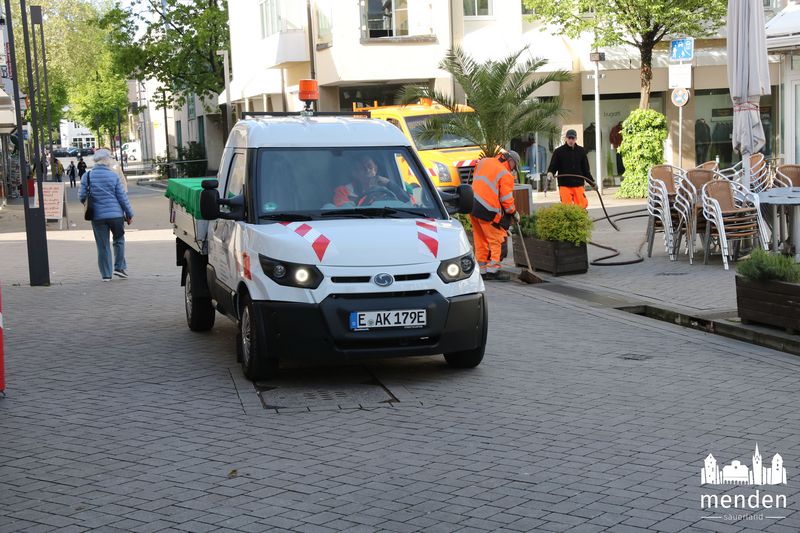 Es ist ein fast ganz normales Bild: Ein Mann läuft durch die Fußgängerzone, hinter ihm ein Fahrzeug des Mendener Baubetriebshofes MBB in Schrittgeschwindigkeit. Der Fußgänger allerdings bemerkt nicht, dass ein Fahrzeug hinter ihm ist, denn das Fahrzeug fährt nahezu lautlos.