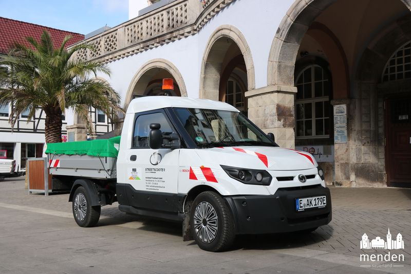 Ein Szenario, an das sich die Mendener ab jetzt gewöhnen müssen. Denn seit heute hat der MBB eine „StreetScooter Work“, also einen elektrobetriebenen Pritschenwagen im Einsatz. Für ein halbes Jahr ist das Fahrzeug angemietet und ab jetzt, nach kleineren Umbauten und Anpassungen, im ganzen Stadtgebiet im Einsatz. Dabei sollen die Vorteile, aber auch die Nachteile für den Bauhof getestet werden.