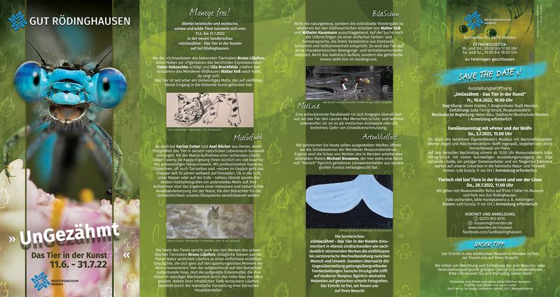 Allerlei heimische und exotische, zahme und wilde Tiere tummeln sich vom 11. Juni bis 31. Juli 2022 in der neuen Sonderschau »UnGezähmt - Das Tier in der Kunst« auf Gut Rödinghausen, die in ebenso eindrucksvollen wie nachdenklich stimmenden Werken die einfühlsame bis zerstörerische Wechselbeziehung zwischen Mensch und Umwelt dokumentiert.