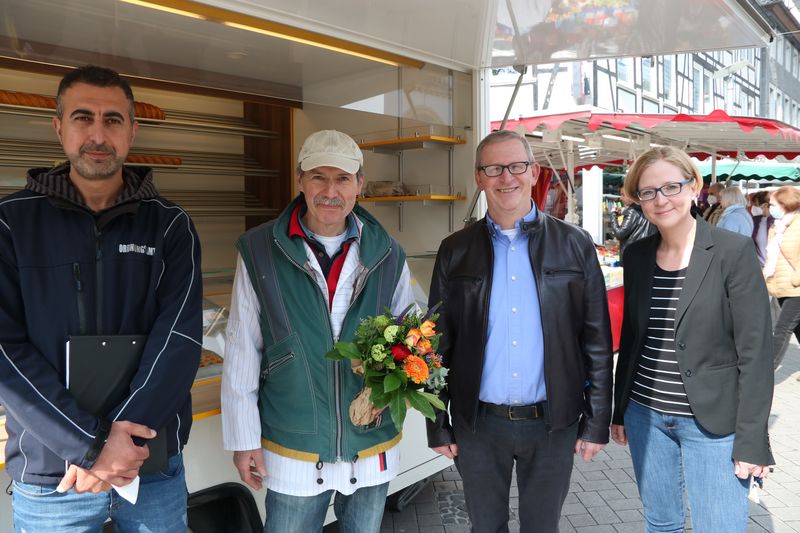 Zwei Jahrzehnte war die Bäckerei Vogt, Dieter und Lucia Vogt aus Hemer, fester Bestandteil des Mendener Wochenmarktes. Mit ihren Verkaufswagen war die Bäckerei aus der Nachbarstadt mitten im Marktgeschehen zu finden und hat die Marktbesucher mit Brot, Brötchen oder Kuchen versorgt. Jetzt geht das Ehepaar Vogt in den Ruhestand. Da es keinen Nachfolger gibt, der den Betrieb weiterführen wird, schließt die Bäckerei und damit auch der Verkauf auf dem Mendener Wochenmarkt. Gemeinsam mit Marktleiter Mehmet Tekin und Ordnungsamtsleiterin Manuela Schmidt hat Bürgermeister Dr. Roland Schröder Dieter Vogt nun verabschiedet.