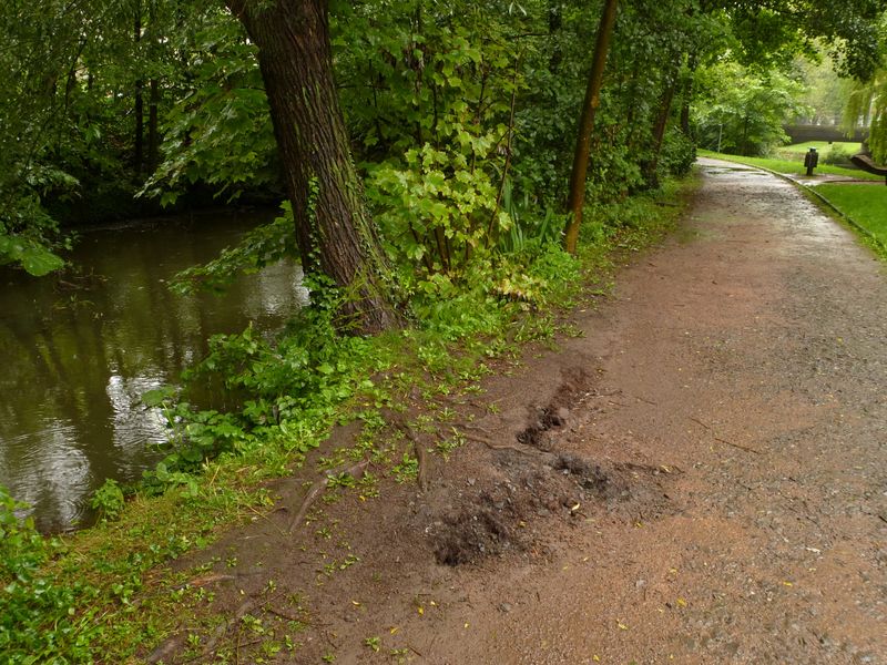 Deshalb muss heute Nachmittag (11.08.2017) auch in einer „Hau-Ruck-Aktion“ ein Baum auf der „kleinen Hönneinsel“ gefällt werden. Die Weide, die unmittelbar am Fluss auf der kleinen Grünfläche unterhalb der Bahnhofsbrücke steht, droht umzustürzen. Das Wurzelwerk des Baumes liegt in Teilen frei, der sogenannte „Wurzelteller“ der dem Baum Halt gibt, ist am Rand gerissen und der Baum senkt sich immer weiter ab. Deshalb ist Eile geboten und ein Unternehmen wird im Auftrag der Stadt diesen Baum fällen. Wird der Baum nicht gefällt, droht Gefahr und die Weide stürzt womöglich in Richtung Bodelschwinghstraße um.