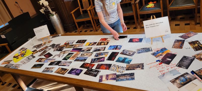 „Heute gibt es kein Denkverbot!“, machte Veronika Czerwinski vor der Ideenfindung nochmal klar. Anhand von Bilderkarten konnten sich die Teilnehmenden außerdem ihre „Traumbibliothek“ basteln und ihre Vorstellungen der räumlichen Gestaltung miteinfließen lassen.
