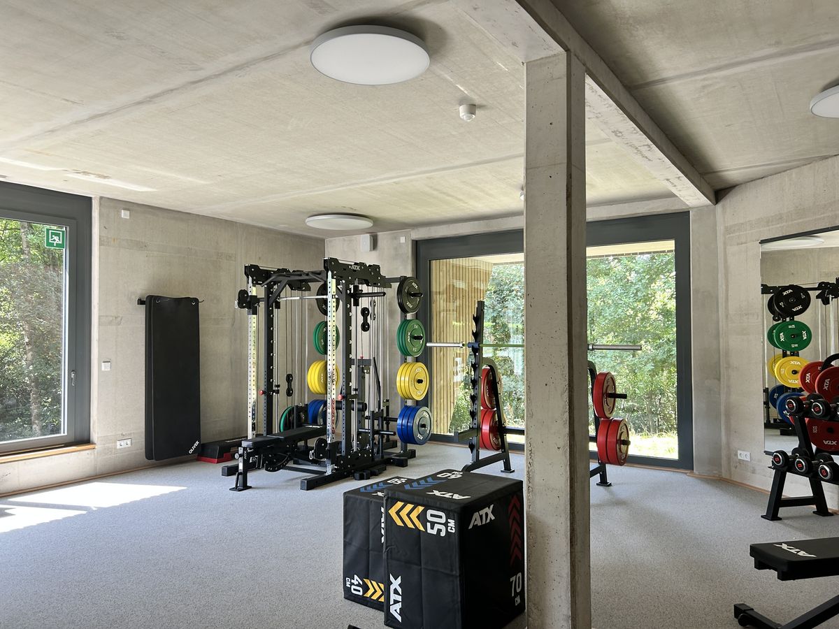 Im 75 m² großen Kraftraum können bis zu 12 Personen Sport treiben. Der Raum ist bestens ausgestattet mit den verschiedensten Kraftstationen und bietet alles für ein modernes und effektives Krafttraining. Zudem gibt es einen großartigen Blick in die angrenzende Natur.