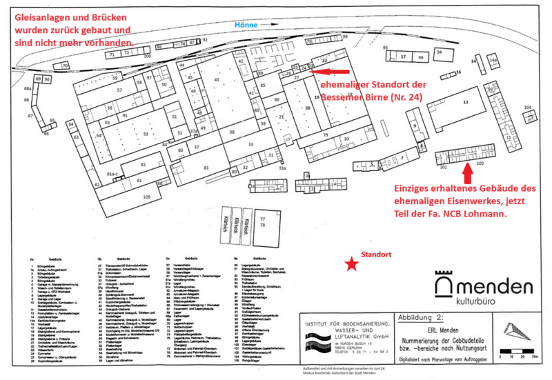 Die hier als Landmarke am Radwanderweg aufgestellte Bessemer-Birne aus dem Eisenwerk Rödinghausen zeigt, wie sehr das städtische Bewusstsein Mendens bis heute von seiner Lage an der malerischen und romantischen Hönne und seiner damit verwobenen Geschichte als Eisen- und Stahlindustrie geprägt ist.