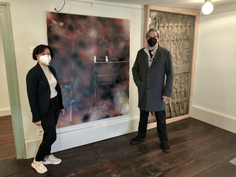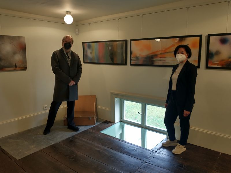 Von der stimmigen Gegenüberstellung des Werkes »volumnia« (2012) mit dem historischen Zeitfenster im zweiten Raum des Zwischengeschosses zeigten sich Patrick Lemke und Museumsleiterin Jutta Törnig-Struck gleichermaßen überzeugt. Nach großzügigem Entgegenkommen seitens des Künstlers konnte auch dieses Großformat für die Museumssammlung angekauft werden. Eine mögliche Neuerwerbung für die Zukunft ist ferner das Werk »Bass (Gravitation)« von 2006, das gegenwärtig noch als Dauerleihgabe auf Gut Rödinghausen ausgestellt ist.