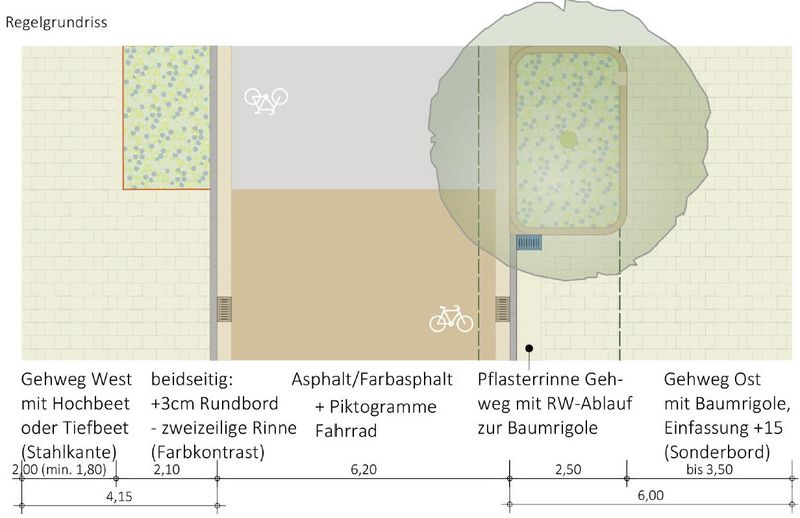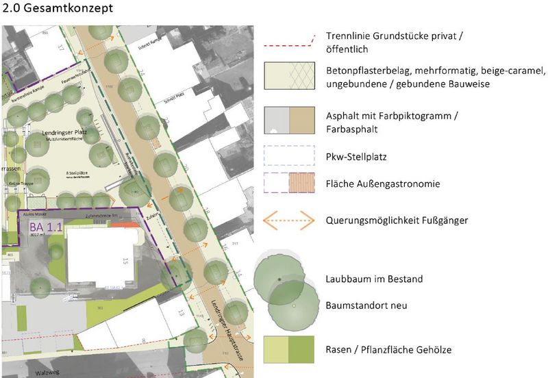 Gleichzeitig haben wir aber auch Parkplatzflächen vorgesehen, die man multifunktional, z.B. auch für Veranstaltungen, nutzen kann. Wir haben Entwicklungsstufen geplant, die im ersten Schritt noch Parkplatznutzungen zwischen den Bäumen entlang der Straße vorsehen, die aber nach und nach als Flächen für Außengastronomie, als Sitzmöglichkeiten, als Spielfläche oder als Fahrradabstellanlage genutzt werden können.