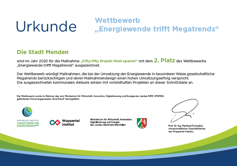 Denn genau darauf zielt das Projekt "Fifty-Fifty", das über das Bundesministerium für Umwelt, Naturschutz, Bau und Reaktorsicherheit (kurz BMUB) gefördert wird. Die Stadt Menden hat dieses Klimaschutzprojekt mit dem Titel "Energiesparmodelle in Kindertagesstätten und Schulen" oder kurz „Fifty-Fifty-Projekt" für Mendener Einrichtungen beantragt und auch bewilligt bekommen. Das Projekt hat eine pädagogische Ausrichtung in Richtung Nutzerverhalten der städtischen Einrichtungen: Energieverbrauch senken in den Bereichen Heizen, Lüften, Beleuchtung und Wasser. Heißt übersetzt: Wenn in den städtischen Schulen und Kindertagesstätten Energiekosten eingespart werden, wird das von der Stadt belohnt. Denn wir machen „Halbe-Halbe" - also Fifty-Fifty mit den Einrichtungen. Die Hälfte des eingesparten Geldes kommt der jeweiligen Einrichtung zu Gute.